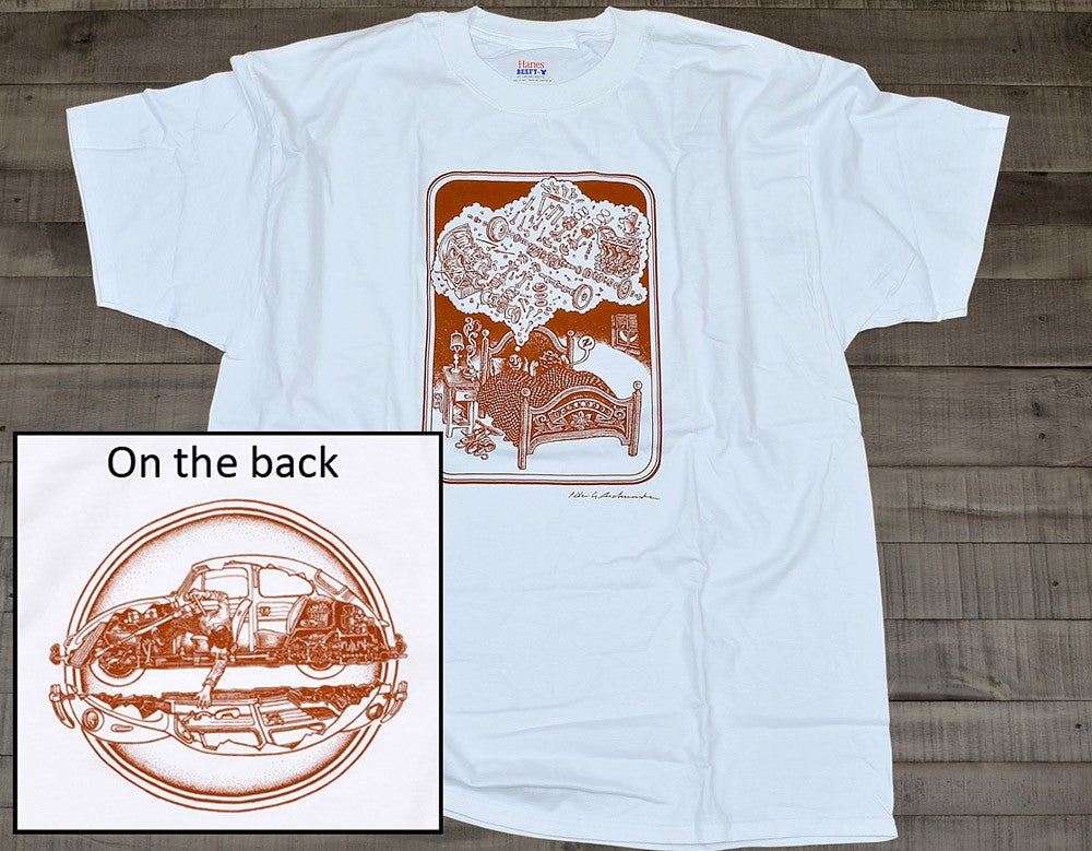 This t-shirt features the classic print of The Dream by Peter Aschwanden. The design is printed in brown ink front and back on a 100% cotton white t-shirt. Large Size. (For extra-large size order number 23962.)