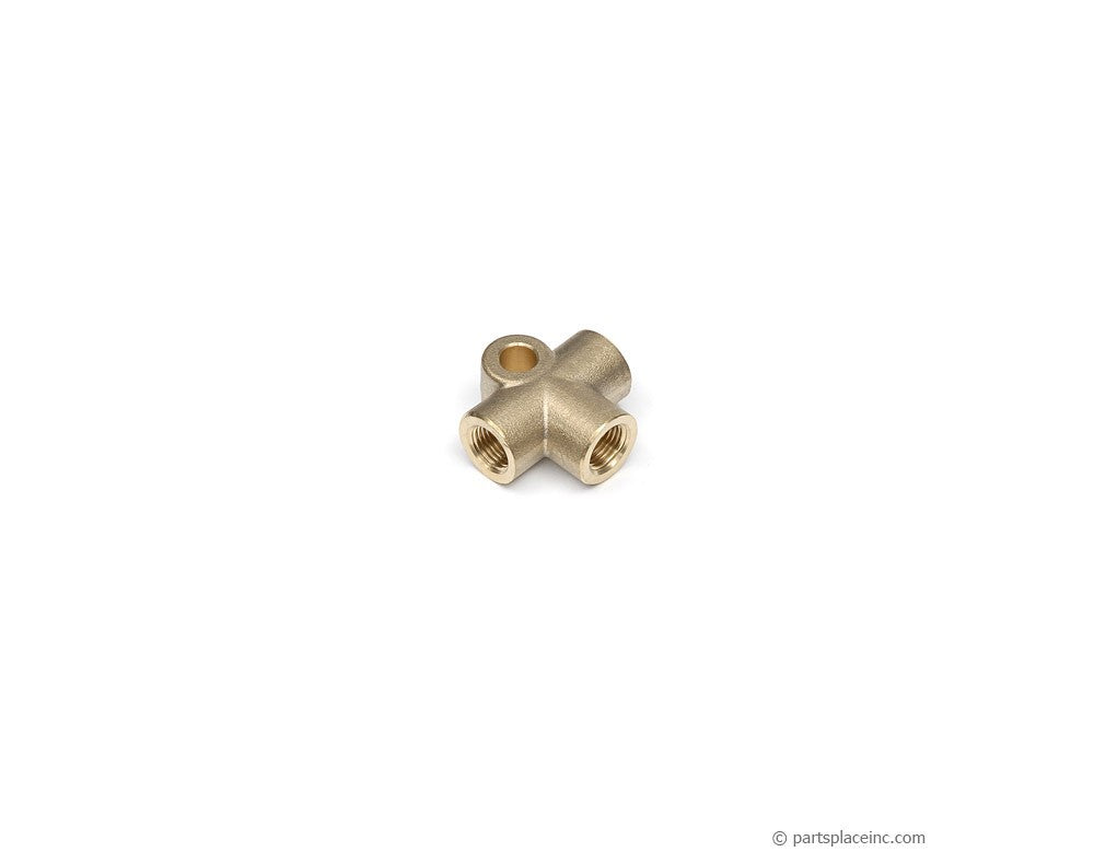 VW brake line connector. This brake line connector is used connect 3 brake lines together. It is a t-shaped brass piece.