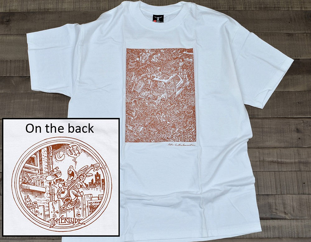 Originally found in The Rabbit Book, this t-shirt features the classic print of The Exploded Rabbit by Peter Aschwanden. The design is printed in brown ink front and back on a 100% cotton off-white t-shirt. Large Size. Note; the picture looks white but this tee is actually off-white. (For Extra-Large size order number 23958.)