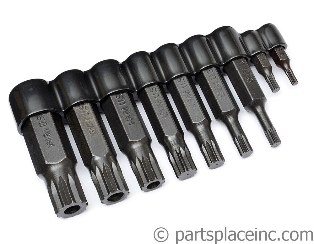 This set includes 4mm, 5mm, 6mm, 8mm, 10mm, 12mm, 14mm, 16mm, and 18mm bits.