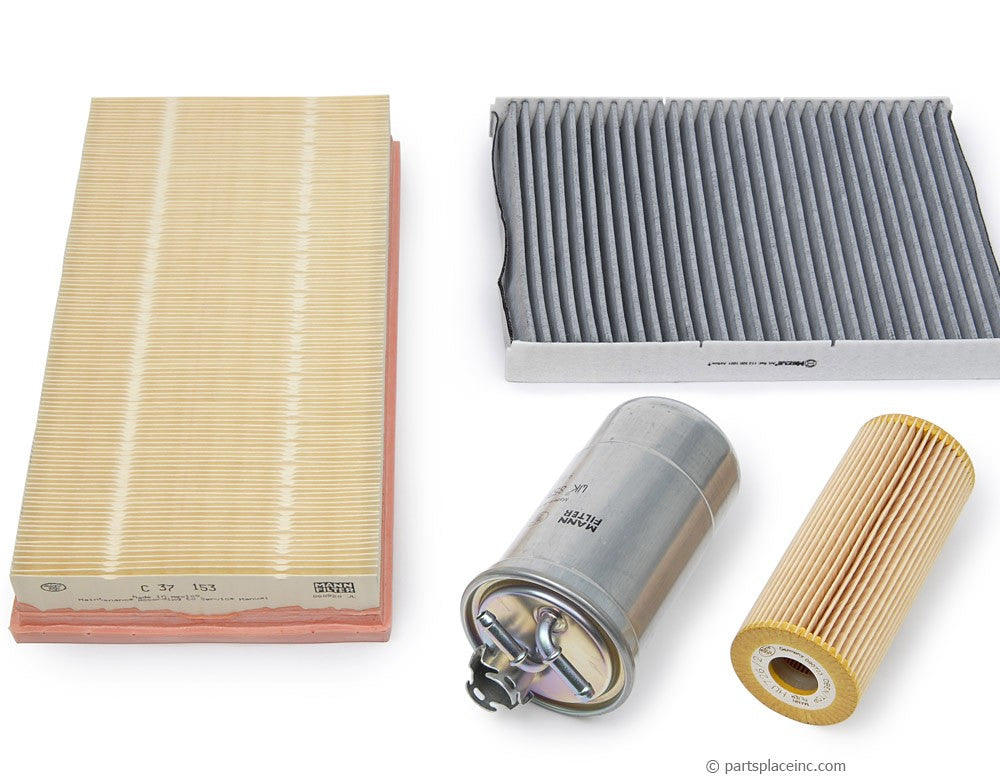 VW fitler kit. This kit includes a fuel, oil, air, and cabin filter. OEM quality Mann/Mahle/Bosch, filters. Superior to the light weight multiple application US discount store fuel filters. These filters are physically heavier by weight and have more filtering material within them than discount store filters.